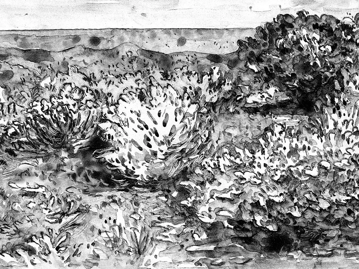 For each piece, I begin by hand making a panel. I then measure and create a clay mixture that I apply with a brush onto the surface of the panel. I sand each thin layer before applying the next. I continue with this process until I build up a surface that provides a warm, earthen tone, a slight tooth for my materials to hold onto, and a substrate that can be altered after mark-making. I use charcoal pencil as well as charcoal watercolor paint to create each visual mark. I then selectively scratch into the charcoal marks, which allows me to work in both an additive and subtractive way, adding depth to each mark and revealing the natural color of the clay beneath. I also occasionally hand make the charcoal watercolor paint from scraps that remain from my creative process. More process info can be seen here.
