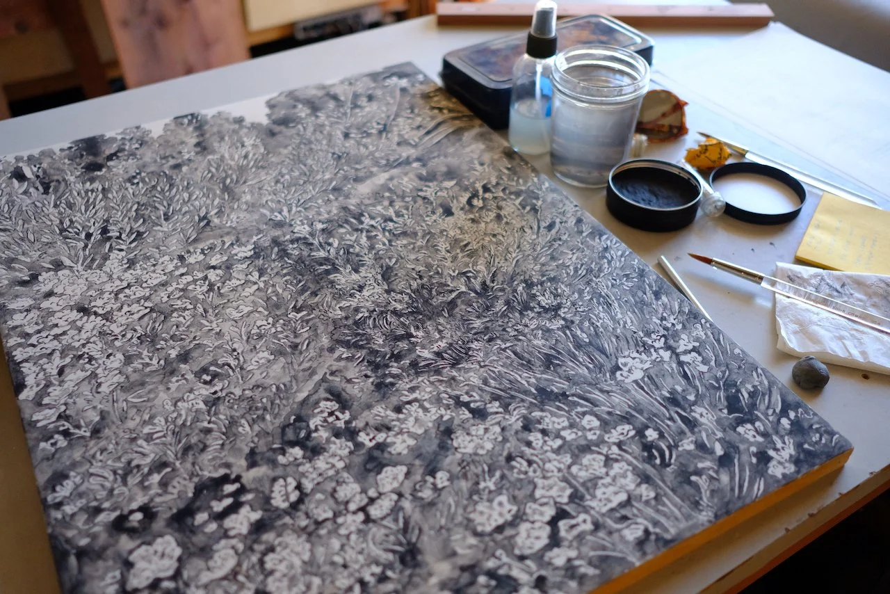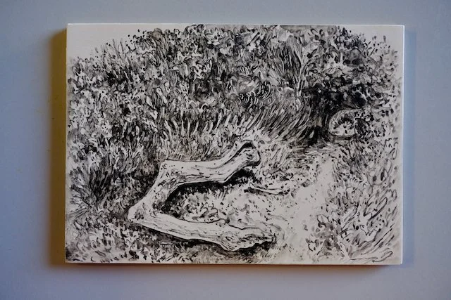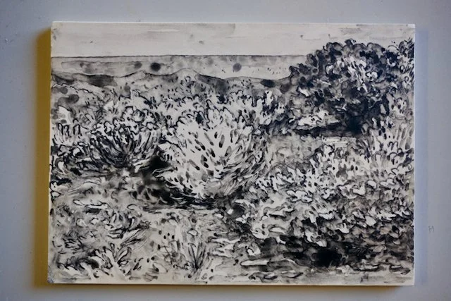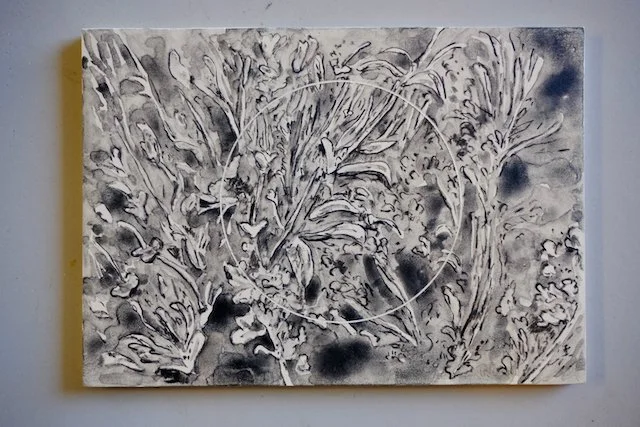 For each piece, I begin by hand making a panel. I then measure and create a clay mixture that I apply with a brush onto the surface of the panel. I sand each thin layer before applying the next. I continue with this process until I build up a surface that provides a warm, earthen tone, a slight tooth for my materials to hold onto, and a substrate that can be altered after mark-making. I use charcoal pencil as well as charcoal watercolor paint to create each visual mark. I then selectively scratch into the charcoal marks, which allows me to work in both an additive and subtractive way, adding depth to each mark and revealing the natural color of the clay beneath. I also occasionally hand make the charcoal watercolor paint from scraps that remain from my creative process.